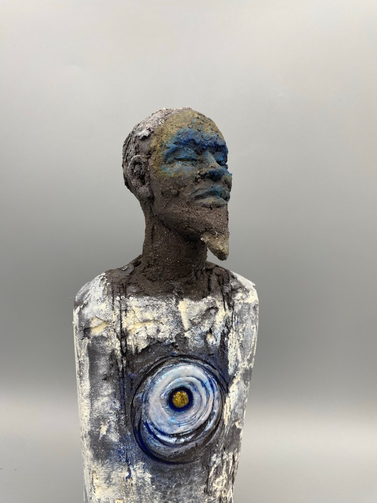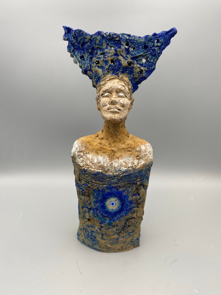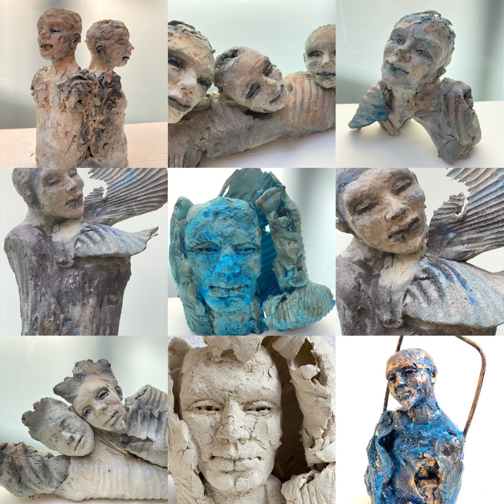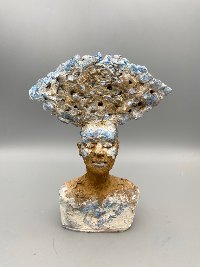 En contact avec mon ressenti, mes doigts caressent, griffent, façonnent la matière argileuse. Le travail de patines et pigments naturels revèlent les expressions, et offrent du vivant aux visages.