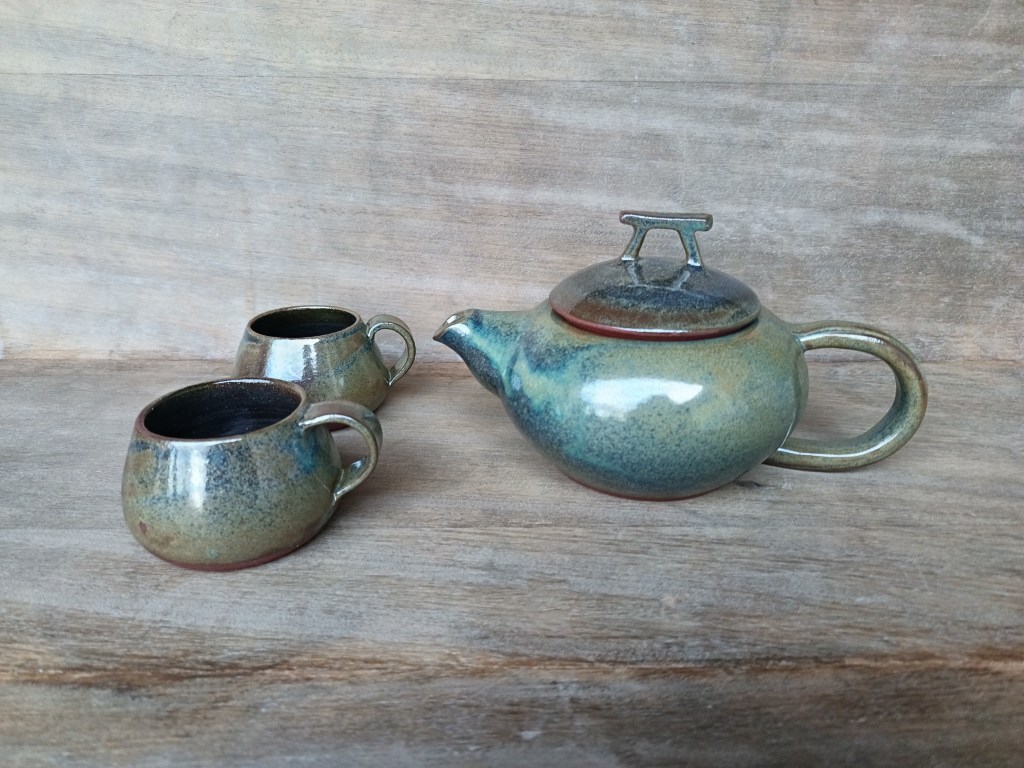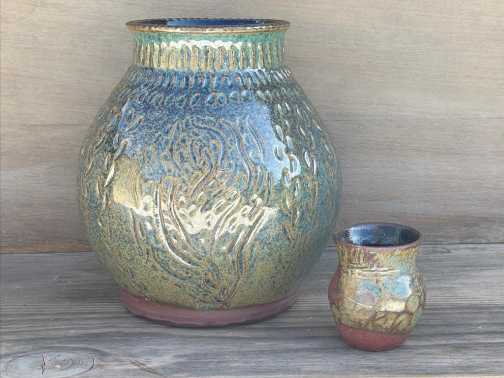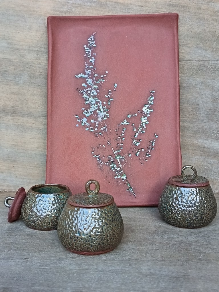 Je fabrique des pièces utilitaires en grès émaillé. J’utilise principalement des grès rouges, qui influencent mon émail tout en contrastant avec lui. Je joue sur la pose de ce dernier en laissant des coulures apparentes pour apporter des nuances propres à chaque pièce. J’enlève volontairement de la matière sur certaines pièces ou bien j’imprime des végétaux. Cela me permet de créer des reliefs qui apportent d’autres variations à l’émail ou de laisser la terre visible en n’émaillant que les creux.